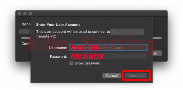 사용자 이름, 비밀번호 입력을 완료하였다면 하단에 Continue 버튼을 클릭합니다.