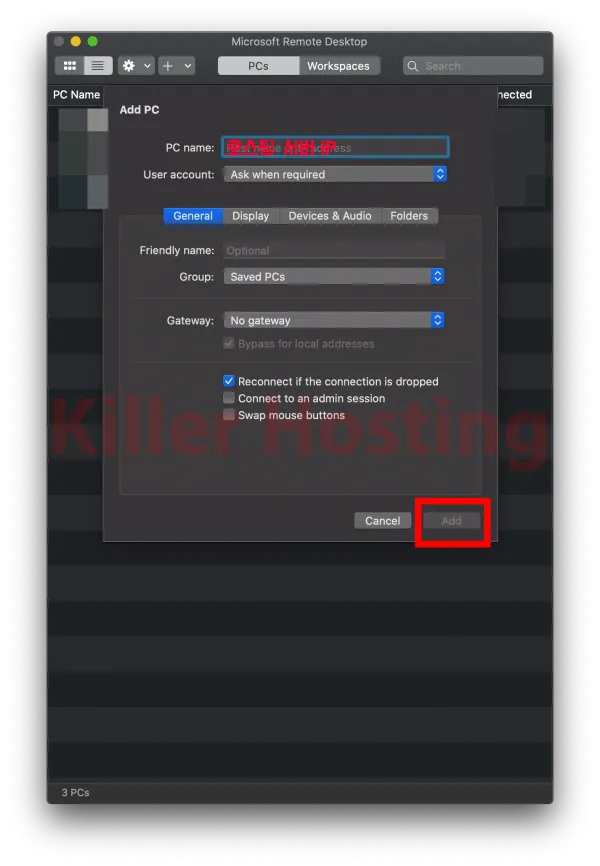 PC name 에는 호스팅 서버의 IP 주소 또는 도메인 주소를 입력하고
