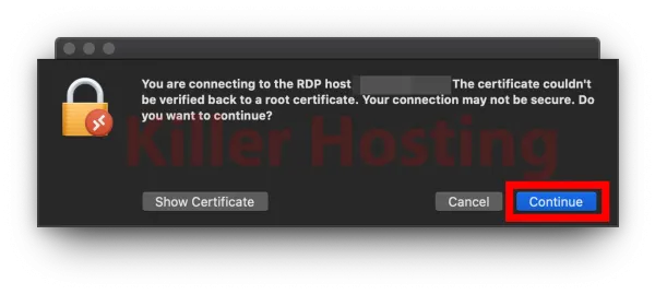Continue 버튼을 클릭하여, 계속 원격접속을 진행합니다.
