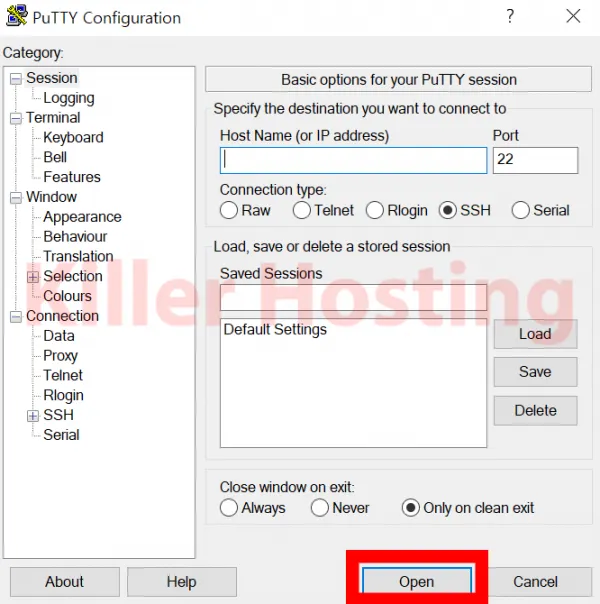 Host Name (or IP address) 칸에 호스팅 서버의 IP 또는 도메인을 입력한 후 Open 버튼을 클릭합니다.