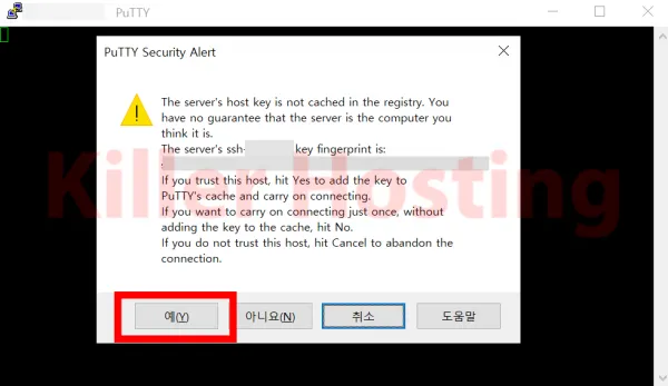 리눅스 호스팅 서버에 처음 접속하면 보안경고가 나오게 됩니다.예(Y)를 클릭합니다.